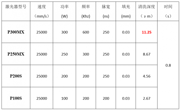 如表3所示,四款激光器在其最佳光學(xué)參數(shù)條件下清洗后樣件照片,樣色依次由深入淺,樣件清洗深度也逐漸降低。因?yàn)楣獍叽罱勇实臏p小,其它三款激光器清洗后樣件表面出現(xiàn)明顯的激光掃描痕跡,而P300MX激光器的高平均功率和光束質(zhì)量使其可以在保證光斑搭接率的同時(shí)獲得更大數(shù)值的單光斑能量密度,從而提高清洗效率和清洗深度。