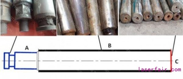 3、C區(qū)域是柱塞桿和液體直接接觸的端面,存在明顯的腐蝕,特別是中心孔處腐蝕嚴(yán)重(或泥沙沖蝕),對(duì)于較深的腐蝕或沖蝕坑洞(超過2mm)先采用手工氬弧焊恢復(fù)尺寸再進(jìn)行高速激光熔覆處理。