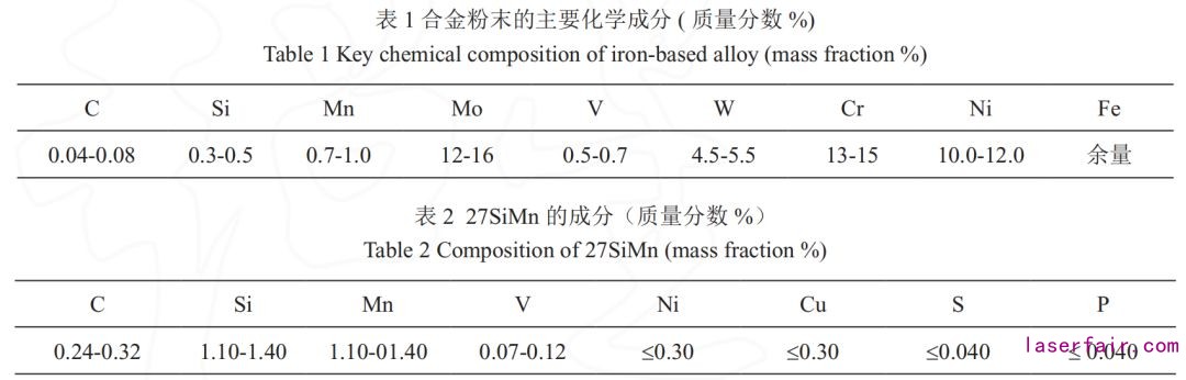 所用合金粉末為自主研發(fā)的鐵基合金粉末SN-135,粉末粒度為-100~+270 目,成分配比如表1所示。所用基材為液壓支架用油缸,規(guī)格為Φ500×30×1500mm,母材為 27SiMn,成分如表 2 所示。
