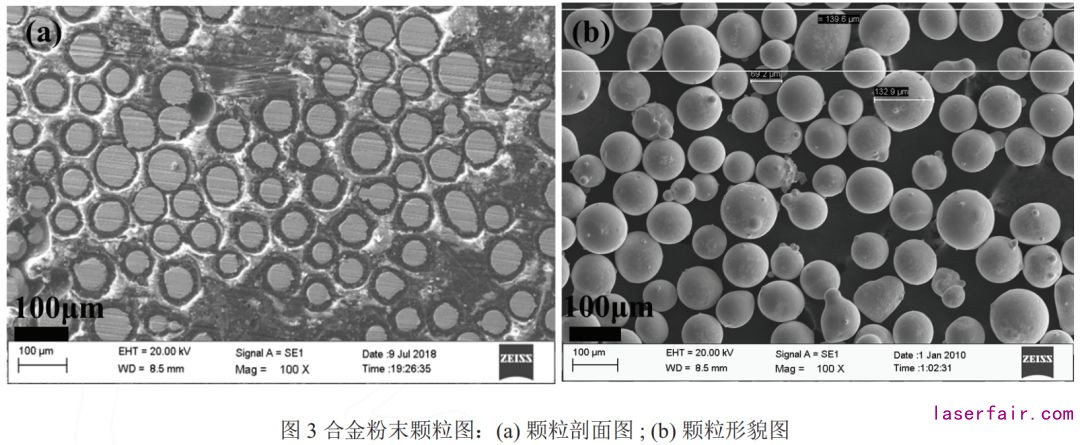 要嚴(yán)格篩選合金粉末。據(jù)悉,合金粉末制備的關(guān)鍵在于顆粒度的均勻性,如若顆粒度不均勻,大、小顆粒度之間即存在相互脫碳、應(yīng)力分布不均等情況,極易導(dǎo)致熔覆開(kāi)裂等缺陷的形成,且嚴(yán)重 影響送粉、熔凝過(guò)程。如圖 3 為本實(shí)驗(yàn)選用的合 金粉末粒度情況,可見(jiàn)粉末顆粒呈圓形分布,球型顆粒度較為均勻光滑,球形度較高,粒度直徑約為 63.6μm ~139.6μm。粒度均勻且球形度高的 合金粉末具備高流動(dòng)性,可以有效保障熔覆送粉 的流暢均勻,有助于降低熔覆缺陷的產(chǎn)生機(jī)率。