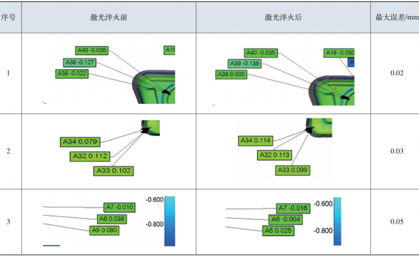 由于淬火區(qū)域大,常規(guī)的火焰淬火或感應(yīng)淬火都會(huì)使工件產(chǎn)生較大的熱變形,導(dǎo)致模具精度無法保證,進(jìn)而需要增加其他的工藝手段來保證,這樣勢必造成模具的加工周期長,且易出現(xiàn)硬度不穩(wěn)定的情況。因此,我們改為采用激光淬火方式,這樣工件變形極小,甚至無變形,不需增加其他工藝手段即可達(dá)到質(zhì)量要求。如圖3和表1所示,我們采用激光淬火方式對某車型的門內(nèi)板進(jìn)行淬火處理,通過藍(lán)光掃描檢測淬火前后的型面變化情況,得知激光淬火后的模具型面能滿足精度要求。