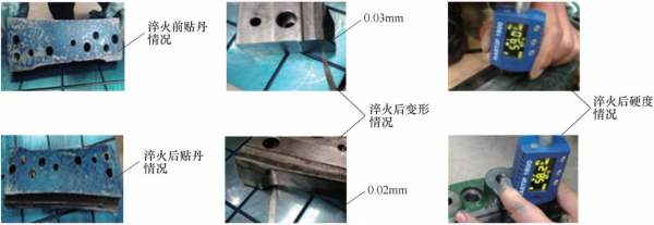 經(jīng)過研究和實(shí)踐,我們發(fā)現(xiàn)激光淬火可以有效地控制鑲件變形和硬度不合格的問題。圖5所示是切邊鑲件和整形鑲件的激光淬火硬度情況和變形情況,從圖中可看出,鑲件采用激光淬火后硬度穩(wěn)定、變形很小,實(shí)現(xiàn)了精加工后淬火的制造工藝,有效提升了加工效率,節(jié)約了加工成本。