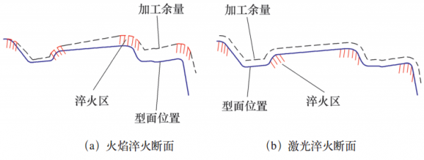 質(zhì)量的影響  相對于傳統(tǒng)淬火方式,采用激光淬火方式的模具型面變形很小、硬度均勻,因此工藝上采取型面精加工到位后再進(jìn)行淬火。圖6所示是采用火焰淬火和激光淬火方式的模具型面斷面。