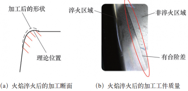 由于火焰淬火采用先淬火再精加工的方式,型面存在硬度不一致的區(qū)域,刀具在切削過程中存在受力不均、易磨損的情況,從而導(dǎo)致型面加工質(zhì)量較差,如圖7所示。