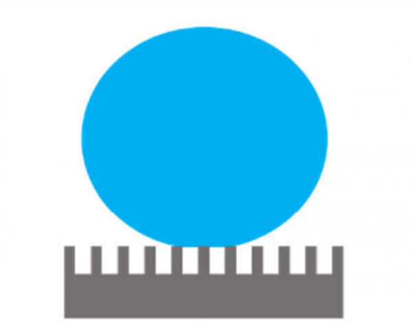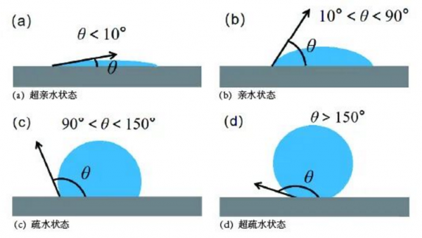 由楊氏方程可知,靜態(tài)接觸角的大小與固體表面化學(xué)自由能有關(guān),可以通過(guò)降低表面化學(xué)自由能來(lái)提高靜態(tài)接觸角。潤(rùn)濕性狀態(tài)也是由靜態(tài)接觸角的大小來(lái)定義。通常情況下,當(dāng)接觸角在0°<θ<10°時(shí),水滴基本平鋪在固體表面,稱為超親水狀態(tài);接觸角在10°<θ<90°時(shí),稱為親水狀態(tài);接觸角在90°<θ<150°時(shí),水滴在表面呈現(xiàn)半球形狀,此時(shí)稱為疏水狀態(tài);而當(dāng)接觸角在150°<θ<180°,滾動(dòng)角<10°時(shí),水滴滴落在表面呈現(xiàn)近球形狀,此時(shí)稱為超疏水狀態(tài)。