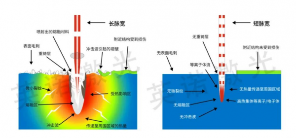 針對(duì)鎂合金耐蝕性差的問(wèn)題,我們采用自主研發(fā)的皮秒激光器對(duì)鎂合金進(jìn)行加工,對(duì)表面處理實(shí)施性價(jià)比更高的激光加工方案以適用于工業(yè)化生產(chǎn)應(yīng)用。激光加工技術(shù)具有可便利地加工出表面微織構(gòu)、可調(diào)控表面潤(rùn)濕性和對(duì)環(huán)境要求低等優(yōu)勢(shì),而超短脈沖激光在加工過(guò)程中更是具有較小的熱影響,如圖1.3所示,對(duì)表面形貌的構(gòu)建有更好的展現(xiàn)性。該項(xiàng)目采用的方法相較于其他表面處理提高耐蝕性,具有高精度、高效率、低成本的優(yōu)勢(shì),以致力于激光在行業(yè)中的應(yīng)用。