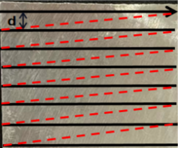 單X軸或單Y軸的掃描路線可以形成周期性的凹槽,但相關(guān)研究表明在同等參數(shù)加工下,單軸加工后的表面接觸角小于雙軸加工,因此采用交叉型掃描路線,如圖1.7所示,先進(jìn)行X軸加工,再進(jìn)行Y軸加工,掃描間距為d。