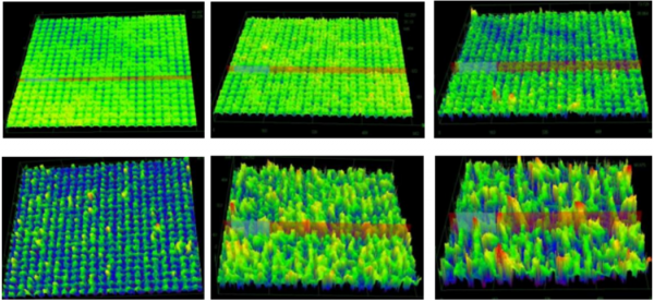研究了激光能量密度對(duì)表面形貌的影響規(guī)律,優(yōu)化了激光平均功率對(duì)微織構(gòu)排列的工藝參數(shù)。圖1.8為不同能量密度對(duì)鎂合金表面形貌的影響,從三維形貌圖中可以觀察到,當(dāng)能量密度為0.956J/cm2和1.611J/cm2時(shí),激光已開始對(duì)鎂合金基體產(chǎn)生刻蝕效果,其中微織構(gòu)并沒有形成很深的凹槽,這是由于激光能量密度過(guò)小,無(wú)法在鎂合金表面形成一定深度;當(dāng)能量密度提升到2.433J/cm2和3.389J/cm2時(shí),表面形成高度不一的微織構(gòu)呈一定周期性排列,且局部受熱影響產(chǎn)生堆積現(xiàn)象,在激光加工過(guò)程中金屬液滴的飛濺有利于微納米顆粒物的產(chǎn)生;當(dāng)能量密度達(dá)到4.445J/cm2和5.58J/cm2時(shí),表面受到了較為嚴(yán)重的熱影響,幾乎全表面發(fā)生重熔現(xiàn)象,加工的微織構(gòu)呈不規(guī)則狀排列。由此可知,當(dāng)能量密度在2.433~3.389J/cm2時(shí),最適合周期性微織構(gòu)的構(gòu)建。