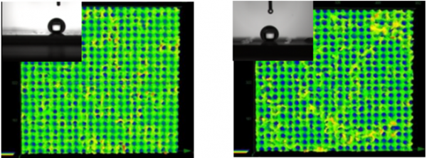 固體材料的潤(rùn)濕性是由表面自由能和粗糙度所決定的[4,5],因此,采用激光技術(shù)構(gòu)建呈周期性排列的凹坑和柱狀凸起的微織構(gòu),伴隨微織構(gòu)周圍由激光加工過(guò)程中產(chǎn)生的微納米顆粒,提高表面粗糙度,當(dāng)液滴滴落在固體表面時(shí),微納米顆粒將“托”著水滴在液體與固體之間形成一層“空氣膜”,使水滴無(wú)法完全潤(rùn)濕表面,更有利于超疏水Cassie狀態(tài)的形成。
