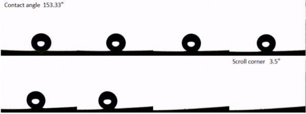 經(jīng)過(guò)不斷的參數(shù)優(yōu)化,當(dāng)能量密度為3.389J/cm2,速度為800mm/s,掃描間距為30μm,重復(fù)次數(shù)為6次和能量密度為4.44J/cm2,速度為1000mm/s,掃描間距為30μm,重復(fù)次數(shù)為7次時(shí),在低溫?zé)崽幚砗蟊砻孢_(dá)到了超疏水的效果,其三維形貌如圖1.9所示,可以觀察到微織構(gòu)呈周期性排列且凹坑存在一定深度,對(duì)其潤(rùn)濕性進(jìn)行測(cè)量,靜態(tài)接觸角分別達(dá)到了150.67°和151.19°;采用高速攝像頭對(duì)其滾動(dòng)角拍攝,如圖1.10所示,測(cè)量滾動(dòng)角為3.5°,完全符合超疏水表面的要求。