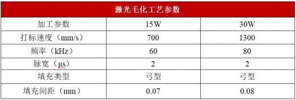 我們在加工毛化效果一致的情況下,分別采用15W和30W兩款不同功率的激光器進行毛化效率的對比,根據(jù)測試結果可見,采用高功率激光器的毛化效率更高,30W激光器相比15W激光器效率提高158%,且30W激光器具有更大的單脈沖能量,在進行加工時可以提高輸出頻率,繼而提高加工速度,因此在玻璃毛化應用上效率更高,更具性價比。