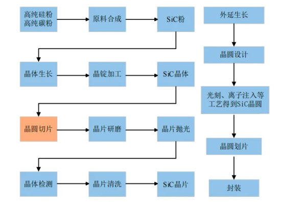 從碳化硅原材料到功率半導(dǎo)體器件的制造涉及多個(gè)關(guān)鍵步驟,包括單晶生長(zhǎng)、晶錠切割、外延生長(zhǎng)以及晶圓設(shè)計(jì)、制造和封裝等工藝。SiC粉末經(jīng)過(guò)合成后,首先制備成碳化硅晶錠,隨后通過(guò)切片、研磨、拋光和清洗等流程制成碳化硅襯底。接著,通過(guò)外延生長(zhǎng)形成外延片,再經(jīng)光刻、刻蝕、離子注入和金屬鈍化等工序制造出SiC晶圓。最終,通過(guò)晶圓劃片工藝得到芯片,并進(jìn)一步封裝成功率器件。