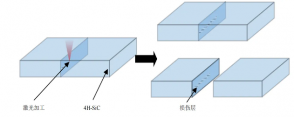 為克服這些問(wèn)題,超短脈沖激光因其獨(dú)特的加工優(yōu)勢(shì)成為SiC晶錠切割的理想選擇。它能夠避免傳統(tǒng)機(jī)械切割中切縫材料的浪費(fèi)以及刀具與晶片直接接觸導(dǎo)致的高表面粗糙度問(wèn)題。Marko Swoboda等人首次提出了激光輔助晶圓冷裂工藝,通過(guò)激光掃描在預(yù)定厚度位置形成損傷層,再利用晶錠表面涂覆的高分子材料在驟冷環(huán)境下裂片,成功用于Si、藍(lán)寶石和熔融石英等材料的剝離。李斌等人通過(guò)激光冷分離技術(shù)對(duì)SiC晶棒進(jìn)行切割,分析了該工藝的關(guān)鍵難點(diǎn),認(rèn)為激光加工是最核心的環(huán)節(jié)。Wenhao Geng等人結(jié)合飛秒激光與帶隙選擇性PEC刻蝕法,對(duì)4H-SiC進(jìn)行剝離,利用能量差實(shí)現(xiàn)了HF溶液中的選擇性損壞。Kosuke Sakamoto等人開發(fā)了一種基于皮秒激光的金剛石切割技術(shù),通過(guò)限制裂紋在{111}解理面方向擴(kuò)展,成功實(shí)現(xiàn)了沿{100}方向的裂紋控制。Hanwen Wang等人研究了表面預(yù)處理對(duì)4H-SiC激光加工與剝離的影響,發(fā)現(xiàn)預(yù)處理能有效提升切片質(zhì)量。Eunho Kim等人利用800 nm、1 kHz的雙脈沖飛秒激光對(duì)4H-SiC進(jìn)行了掃描剝離,成功獲得了均方根粗糙度為5微米、切削損耗小于24微米的剝離表面。