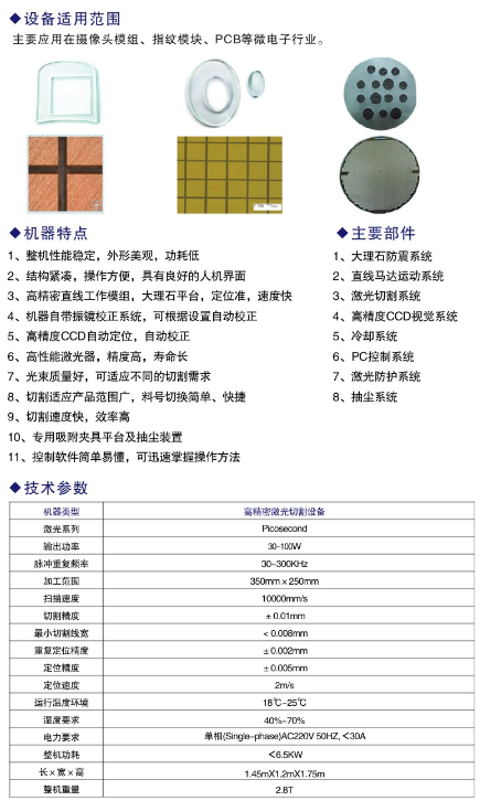 2、基礎(chǔ)配置,采用歐美進口激光器,超精細超快冷激光加工,配合高速振鏡掃描系統(tǒng)或切割系統(tǒng),光斑可達3-6微米,切割縫寬可達14微米,加工準確精致,速度快效果好,幾乎無任何熱影響區(qū),良品率高。