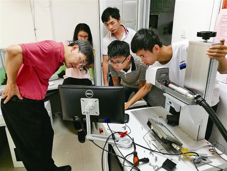 洪明輝院士(左一)在溫大實(shí)驗(yàn)室指導(dǎo)搭建激光彩色標(biāo)刻系統(tǒng) 受訪者供圖