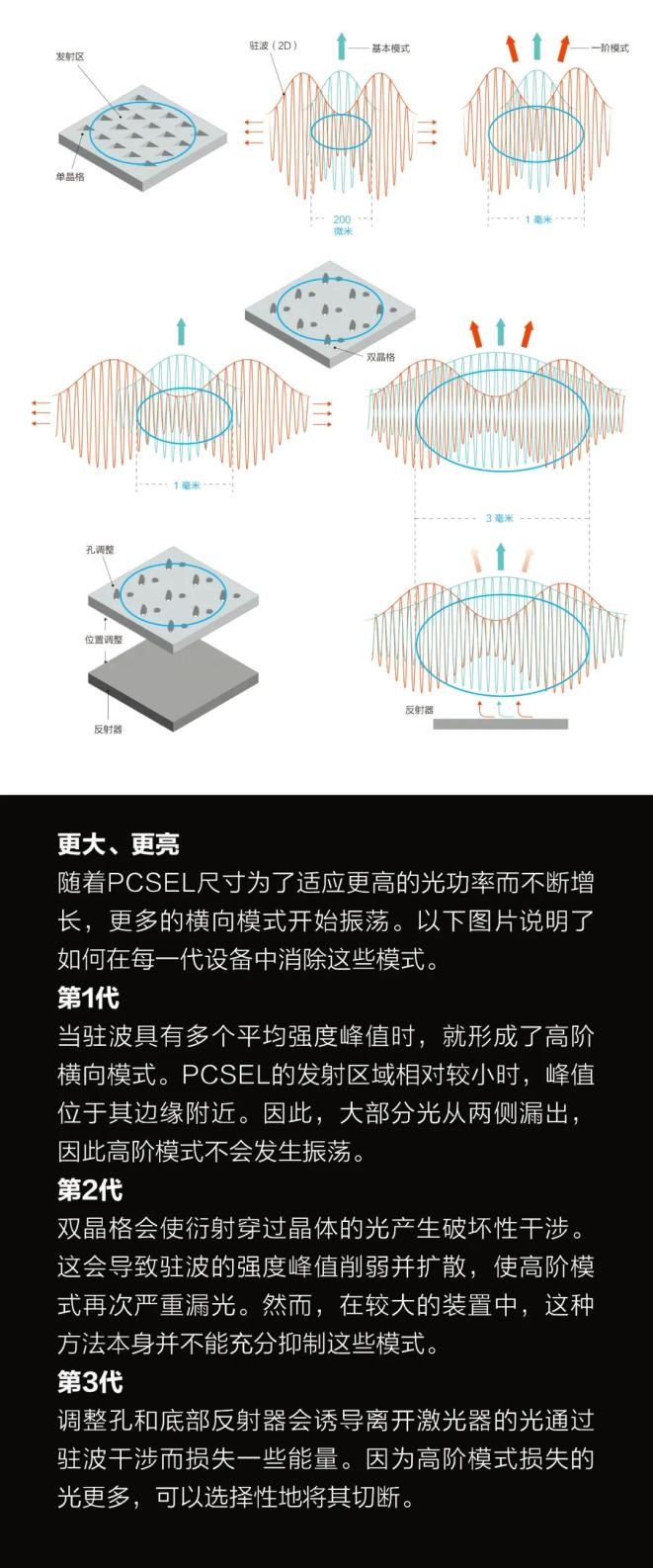 在前幾代設(shè)備中,這種反射器的作用僅僅是將向下衍射的光從激光器的發(fā)射面反射出來。通過調(diào)整其位置(以及光子晶體孔的間距和形狀),我們發(fā)現(xiàn)可以控制反射,使其與光子晶體層內(nèi)振蕩的二維駐波產(chǎn)生有效的干涉。本質(zhì)上,這種干涉或耦合會導(dǎo)致分離波失去部分能量。分離波越偏斜,損失的光就越多。然后就再沒有高階模式了。