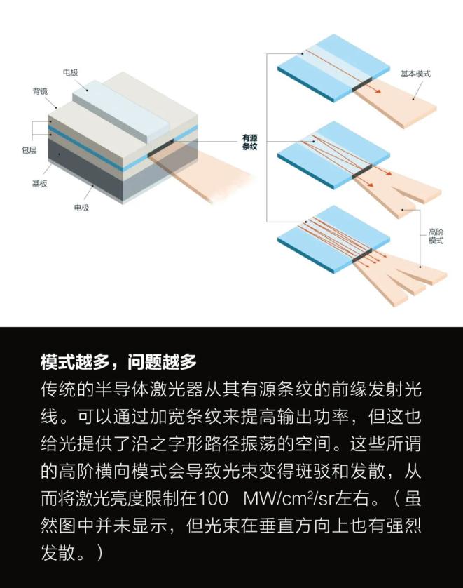 這種標準條紋方法的問題在于,它很難在不犧牲光束質(zhì)量的情況下提高輸出功率。極度集中的光線會對半導(dǎo)體造成災(zāi)難性的破壞,因此半導(dǎo)體激光器的功率受其發(fā)射面積的限制。通過加寬條紋可以實現(xiàn)更大功率,這便是所謂的寬面積激光器所使用的策略。但更寬的條紋也為振蕩光提供了走之字形側(cè)向路徑的空間,從而形成所謂的高階橫向模式。