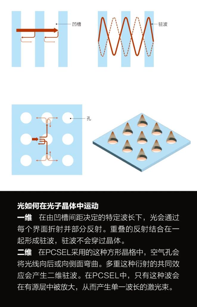 其工作原理如下:當該長度的波在有源層中產(chǎn)生時,鄰近光子晶體層中的孔就像微小的鏡子一樣,將光向后或向側(cè)面彎曲。多重這種衍射的共同效應(yīng)會產(chǎn)生二維駐波,然后被有源層放大。其中一些振蕩光還會向上和向下衍射,并從激光器的頂部漏出,產(chǎn)生單一波長的表面光束。