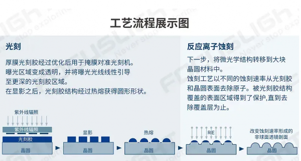 炬光科技采用光刻-反應(yīng)離子蝕刻法晶圓級微納光學(xué)精密加工制造這一核心技術(shù)實現(xiàn)硅材質(zhì)、熔融石英材質(zhì)微納光學(xué)元器件的大批量生產(chǎn)制造,為光通信行業(yè)提供多種透鏡類型、形狀、排布及陣列數(shù)量的標(biāo)準(zhǔn)化產(chǎn)品及定制服務(wù),例如非球單透鏡(可帶V槽)、N×N大透鏡陣列、1×N非球透鏡陣列、集成透鏡棱鏡和衍射光學(xué)元件(DOE)等,可靈活滿足多樣化應(yīng)用需求。其相關(guān)產(chǎn)品輪廓偏離度最小可實現(xiàn)RMS<10nm,反射率在AOI=0-15°R時極低,并支持客戶定制鍍膜。我們對產(chǎn)品質(zhì)量嚴(yán)格把控,確保產(chǎn)品在各種復(fù)雜光學(xué)系統(tǒng)中擁有卓越表現(xiàn),可做到產(chǎn)品側(cè)邊垂直度±1°,尺寸公差±15 μm(硅材質(zhì))、±25μm(熔融石英材質(zhì)),厚度公差±10μm,曲率半徑范圍150-10000μm、公差±3%甚至更小。