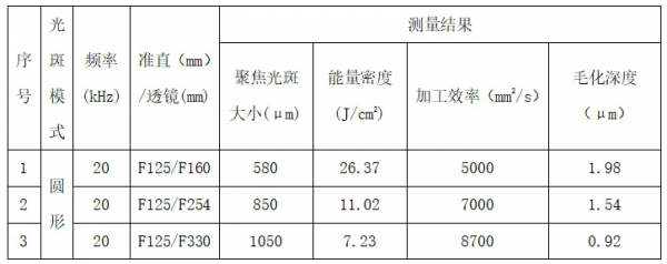 表1 不同透鏡下對應(yīng)的能量密度和毛化深度