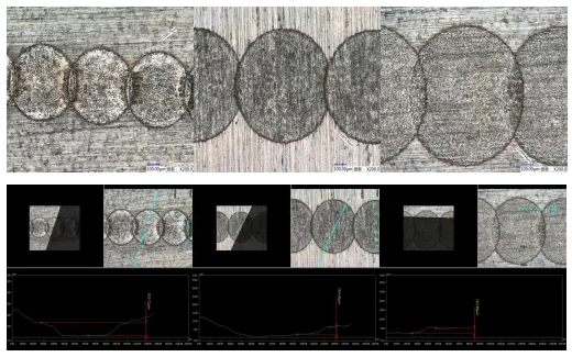 表2為P1000H-P與某進(jìn)口激光器毛化效果對比,設(shè)置兩組點距和線距分別為0.4mm/0.8mm和0.4mm/0.4mm,從微觀效果圖對比可以看出兩款激光器毛化光斑分布均勻一致,熔池形態(tài)一致,經(jīng)3D顯微鏡測量300倍下兩款激光器在相同點線距下Ra值和Rz值相差不大,經(jīng)C公司涂覆驗證,P1000H-P批量毛化試片均達(dá)到檢測要求,由此可以得出,P1000H-P在鋁制電芯毛化應(yīng)用上完全可以替代進(jìn)口,為儲能企業(yè)降低生產(chǎn)成本。