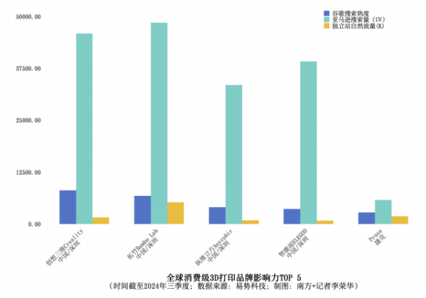 “過去幾年,深圳3D打印品牌正在全球崛起?!笨缇称放蒲芯繖C構(gòu)易勢創(chuàng)始人陳雄介紹,易勢通過分析谷歌搜索熱度、亞馬遜搜索量、獨立站自然流量等數(shù)據(jù)發(fā)現(xiàn),消費級3D打印企業(yè)全球前5中有4家來自深圳,包含創(chuàng)想三維、拓竹、縱維立方、智能派。其中,創(chuàng)想三維在谷歌搜索熱度、亞馬遜搜索量中領(lǐng)先其他三家深圳公司,而獨立站搜索量的前五排名數(shù)據(jù)中,拓竹一枝獨秀。相比而言,獨立站因為跟商家聯(lián)系緊密,用戶黏性更強。
