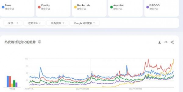 最近5年前5家企業(yè)的谷歌搜索熱度值,拓竹后來居上。