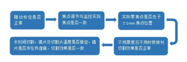 (4)萬瓦切割頭鏡片檢查,先用白紙查看萬瓦光纖激光器紅光是否有黑點,然后低功率出激光,用黑色感光紙查看光斑是否有點,最后取出鏡片在顯微鏡下檢查。