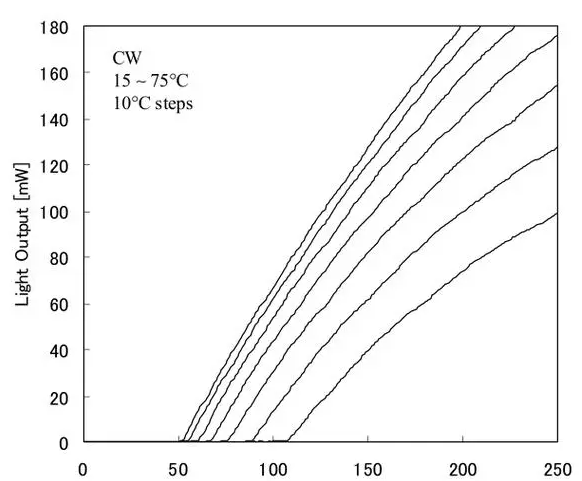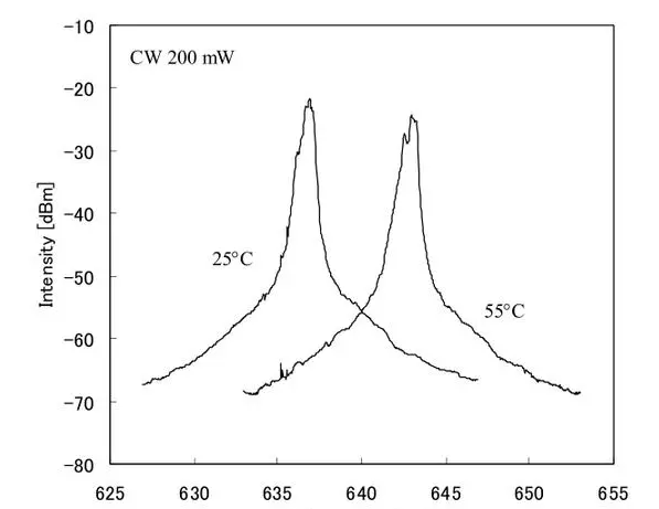 在可見紅光的波長范圍內(nèi),人們希望波長越短,亮度越高,因為隨著光源波長越短,人眼的靈敏度越高。一個660nm激光二極管是很好的開發(fā)和商業(yè)化的DVD光盤拾取應(yīng)用。然而,對于顯示應(yīng)用來說,更短的波長(~ 640 nm)是必要的,因為640 nm的眼睛靈敏度幾乎是660 nm的三倍。640nm LD的輸出功率要求至少大于50mw。但這取決于投影儀的實現(xiàn)方法。