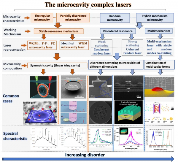 最近,材料、微納技術(shù)和人工智能的快速發(fā)展為復(fù)雜激光器的產(chǎn)生、控制和應(yīng)用帶來了新的機遇和挑戰(zhàn)。在此,天津航海儀器研究所、電子科技大學(xué)和深圳大學(xué)的研究人員(天津市量子精密測量重點實驗室朱洪楊博士和電子科技大學(xué)光纖傳感與通信教育部重點實驗室博士研究生何真為共同第一作者,電子科技大學(xué)的張偉利教授和深圳大學(xué)高等研究院的馬瑞副研究員為通信作者)從微腔結(jié)構(gòu)無序度漸增的視角出發(fā),系統(tǒng)地研究了各種類型的微腔復(fù)合激光器的產(chǎn)生、調(diào)控及前沿應(yīng)用進展。主要介紹了無序微腔激光器的歷史發(fā)展、特點、規(guī)律和應(yīng)用,并對微腔復(fù)合激光器的未來發(fā)展趨勢進行了討論。該成果以“Microcavity complex lasers:from order to disorder”為題,以特邀綜述發(fā)表于ANNALEN DER PHYSIK上。