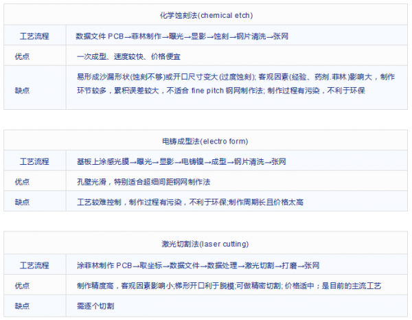 SMT鋼網(wǎng)(SMT模板)“開孔”制作工藝分類有化學(xué)蝕刻法(chemical etch)、電鑄成型法(electro form)和激光切割法(laser cutting)。