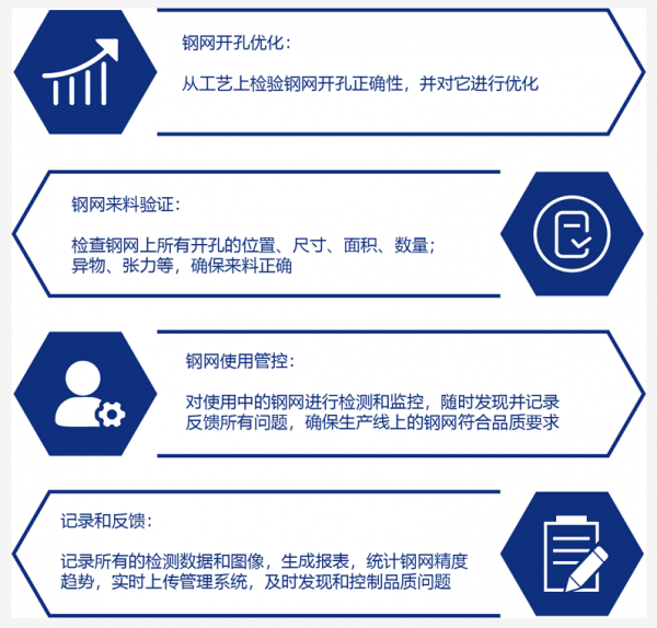 替代人工檢測,建立鋼網(wǎng)管控標(biāo)準,有效減少人工成本,大幅提高產(chǎn)品品質(zhì)??梢钥焖俳鉀Q開鋼網(wǎng)及鋼網(wǎng)清洗問題,改善清洗工藝,并從源頭上解決多錫、少錫,連旱等印刷問題。