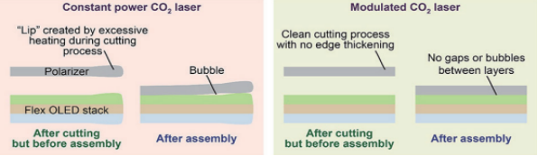 這些厚邊會(huì)在隨后的生產(chǎn)步驟中帶來(lái)問(wèn)題,特別是當(dāng) OLED 顯示器頂部需要添加對(duì)比度增強(qiáng)偏光片時(shí)。這種偏光片也采用二氧化碳雷射切割,因此存在同樣的邊緣增厚問(wèn)題。
