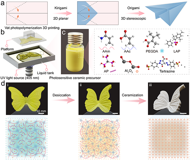 該團隊受折紙/剪紙藝術(shù)的啟發(fā),以水性無機粘結(jié)劑磷酸二氫鋁溶膠為水凝膠單體分散介質(zhì),將水凝膠單體和納米陶瓷粉體混合來制備光敏性水凝膠陶瓷漿料;利用光固化3D打印獲得了具有優(yōu)異的延展性、形狀適應(yīng)性、抗疲勞性且可二次變形的水凝膠柔性骨架;依次經(jīng)過脫水干燥、低溫脫脂和高溫燒結(jié)等步驟,實現(xiàn)了具有超低收縮、高陶瓷產(chǎn)率和形狀保真度的懸空大跨度陶瓷結(jié)構(gòu)。該工作設(shè)計的柔性水凝膠基陶瓷前驅(qū)體能夠?qū)崿F(xiàn)從平面形狀到3D立體結(jié)構(gòu)的轉(zhuǎn)變,突破了傳統(tǒng)硬質(zhì)/脆性陶瓷前驅(qū)體制造復(fù)雜陶瓷結(jié)構(gòu)的局限。