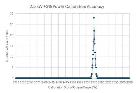 優(yōu)勢究竟有多大?該圖顯示了 90 種不同的 Coherent ARM 可調(diào)環(huán)模光纖激光輸出功率的實際測試數(shù)據(jù)。每個裝置的輸出功率均為 2.575 千瓦。使用外部功率計測量的功率讀數(shù)的標準偏差為 5.4瓦 – 僅為0.2%。 這意味著所有這些雷射對于給定的焊接任務都會產(chǎn)生幾乎相同的結(jié)果。再次,這確保了參數(shù)能夠隨著時間的推移和多臺雷射“忠實”地再現(xiàn)。